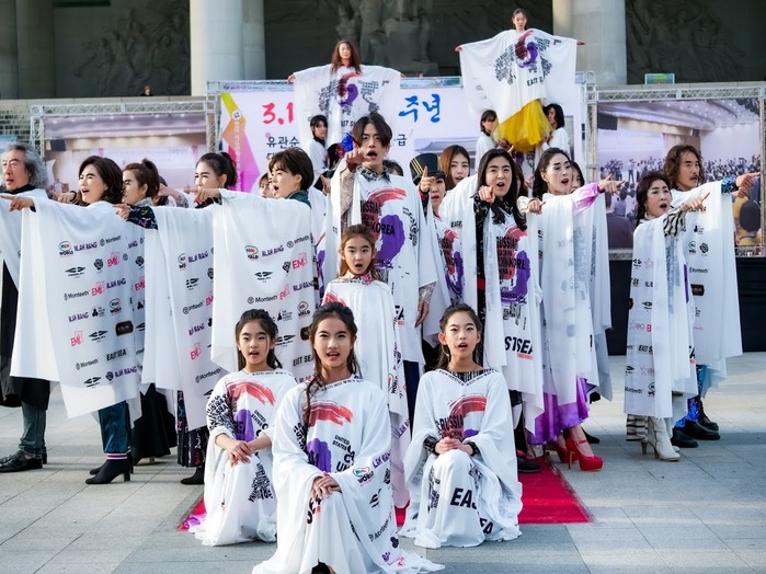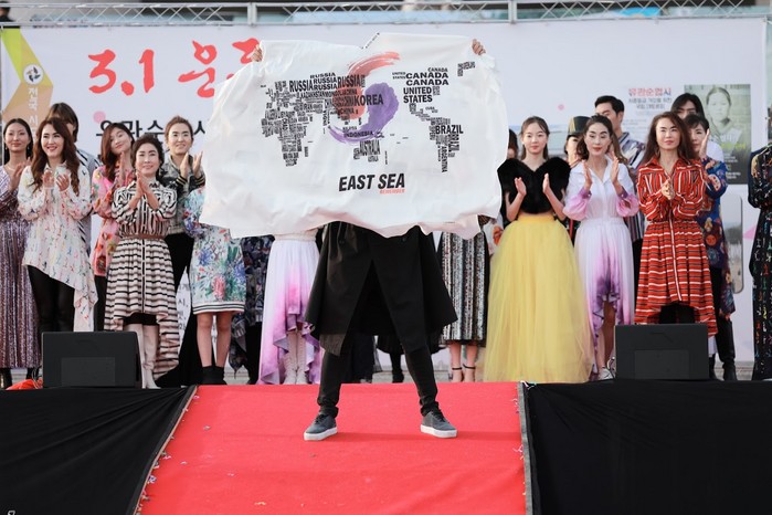 최근 독도 문제와 동해 표기 논란으로 인한 일본 제품 불매운동과 더불어 GSOMIA 종료에 대한 일본의 불편한 대응 등 국가간의 갈등에 일침을 가하는 캠페인 브랜드 EAST SEA 를 전개하고 일명 “동해티” 를 배포함으로써 세상에 잘못된 진실을 바로잡기 위한 노력을 펼치고 있는 박정상 디자이너는 100년 전 독립열사들이 대한민국의 독립을 외쳤던 것처럼 100년 후인 현재 대한민국의 국민으로서 자신이 할 수 있는 일을 하겠다며 무대인사에서 EAST SEA 슬로건을 펼치며 “대한민국 만세”를 외쳤다.