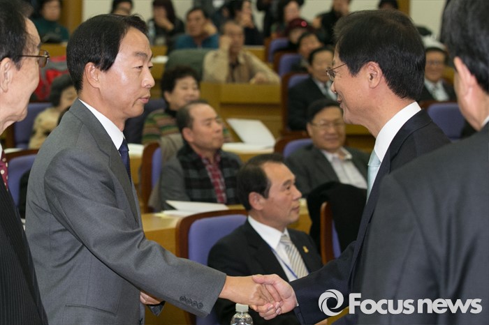 (서울=포커스뉴스) 고 김영삼 전 대통령의 차남 현철(왼쪽) 씨가 3일 오후 서울 여의도 국회 의원회관에서 열린 역사 바로 세우기 학술대회에 참석해 천정배 의원과 악수하고 있다.