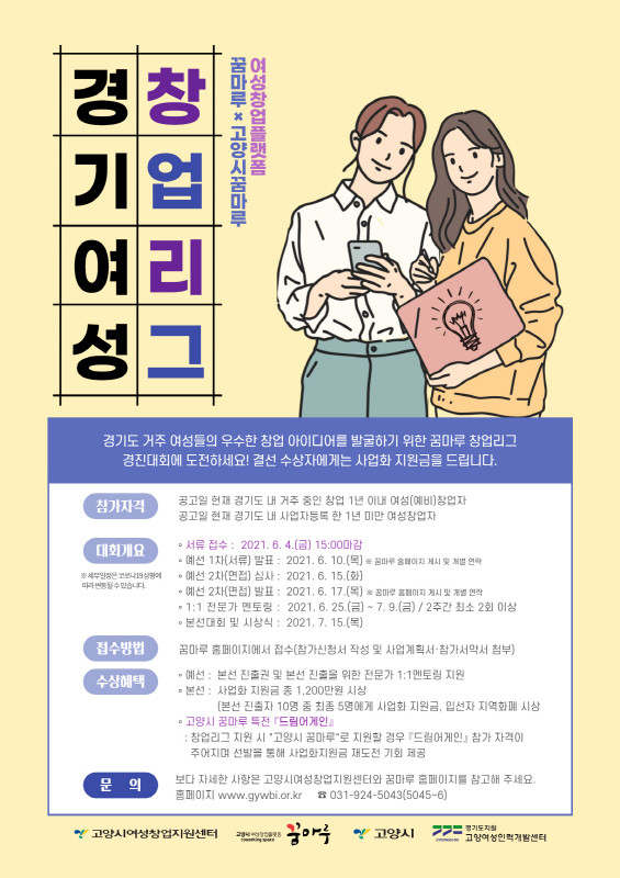 대회 참가자격은 경기도 내 거주 중이거나 사업자 등록을 한 여성 예비창업자 및 창업 1년 이내 여성창업자다. 서류 접수는 6월 4일까지 경기 여성창업플랫폼 꿈마루 홈페이지 내 ‘경기여성 창업리그’메뉴를 통해 할 수 있다.