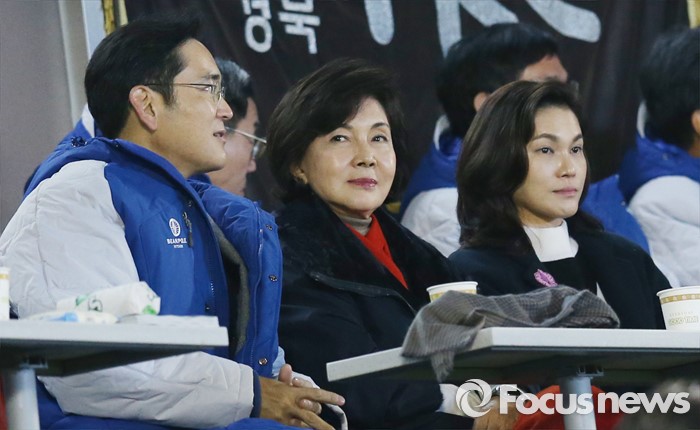 △  29일 이재용 삼성 부회장, 홍라희 여사, 이서현 제일기획 경영담당 사장(왼쪽부터)이 잠실구장을 찾아 삼성-두산 한국시리즈 3차전을 관전하고 있다. 우정식 기자 uhcho@focus.kr