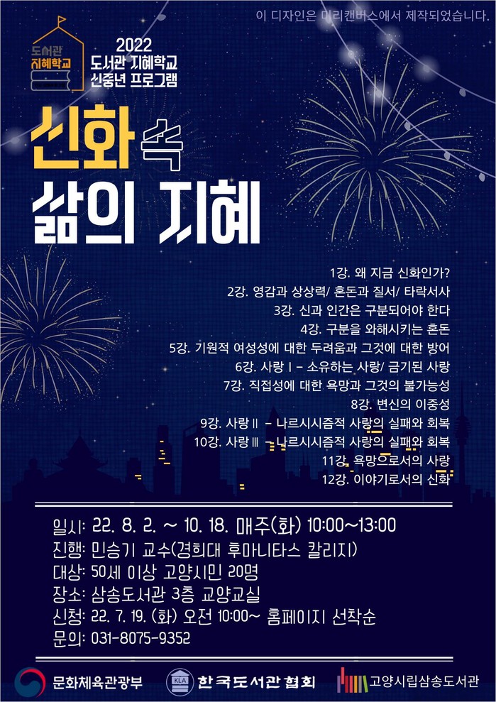 [부자동네타임즈 김인수기자] 고양특례시(시장 이동환) 삼송도서관에서 오는 8월 2일부터 10월 18일까지 민승기 교수와 함께 신화 속 지혜와 의미를 배울 수 있는 2022 도서관 지혜학교 ‘신화 속 삶의 지혜’를 진행한다.