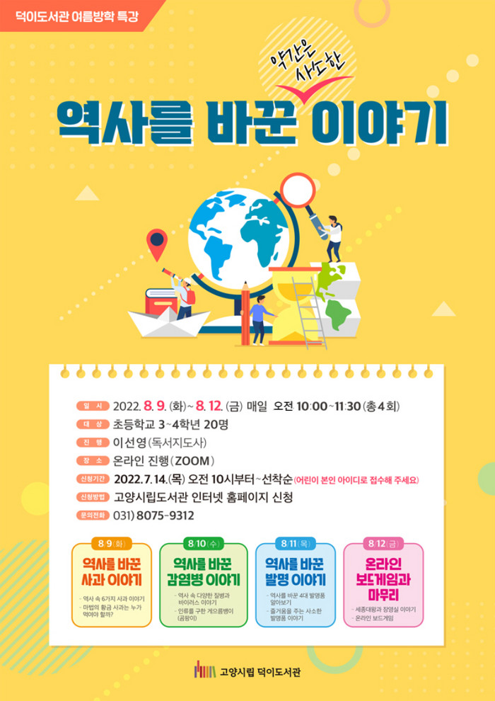 [부자동네타임즈 김인수기자] 고양특례시(시장 이동환) 덕이도서관이 방학을 맞이하는 초등학생을 대상으로 8월 9일부터 8월 12일까지 여름방학특강 역사를 바꾼 이야기를 운영한다. 프로그램은 이선영 독서지도사가 온라인(ZOOM)에서 초등 3~4학년 20명을 대상으로 매일 오전 10시부터 11시 30분까지 진행한다.