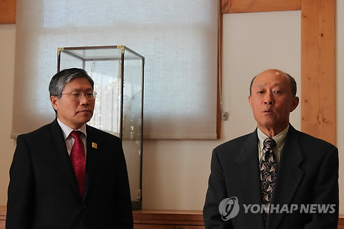 △ 광복군 비행사 장병훈 건국훈장 전달받은 외손자 심정윤씨 (샌프란시스코=연합뉴스) 임화섭 특파원 = 일제강점기에 광복군 비행학교 교관을 지낸 애국지사 고(故) 장병훈(1894∼1979)씨의 외손자 심정윤(사진 오른쪽)씨가 1월 30일(현지시간) 한동만(사진 왼쪽) 주(駐)샌프란시스코 총영사로부터 외할아버지의 건국훈장 애족장을 전달받고 나서 소감을 밝히고 있다. 2015.2.1 solatido@yna.co.kr