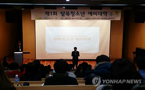 △ 서울대에서 열린 '제1회 탈북청소년 예비대학' (서울=연합뉴스) 고은지 기자 = 서울대학교가 2일 오후 관악캠퍼스 기초사범교육협력센터에서 개최한 '제1회 탈북청소년 예비대학' 입학식. 올해 첫 시행되는 예비대학에는 탈북 청소년 30명과 서울대 학생 30명이 참석했다. 이들은 4박5일간 함께 숙식하면서 '멘토와 함께하는 공부방', '재외국민, 외국인과의 비정상회담!', 탈북 대학생 선배들과의 만남' 등 다양한 프로그램을 진행할 예정이다. 2015.2.2 <<사회부 기사 참조>> eun@yna.co.kr
