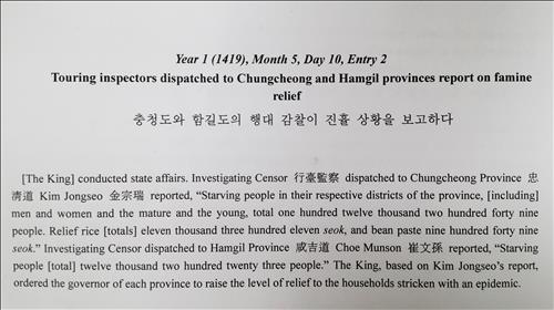 "[The King] conducted state affairs. Investigating Censor 行臺監察 dispatched to Chungcheong Province 忠淸道 Kim Jongseo 金宗瑞 reported, 'Starving people in their respective districts of the province, [including] men and women and the mature and the young, total one hundred twelve thousand two hundred forty nine people. Relief rice [totals] eleven thousand three hundred eleven seok, and bean paste nine hundred forty nine seok.'(후략)"