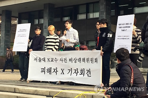 △ "학생 성추행 의혹 K교수 사태 명백히 밝혀야" (서울=연합뉴스) 서울대 학생들이 27일 관악캠퍼스 대학본부에서 기자회견을 열고 자신이 가르치는 학생 등을 상습적으로 성추행한 의혹을 받는 서울대 수리과학부 K교수에 대한 학교 측의 철저한 진상조사를 요구하고 있다. K교수는 전날 사표를 제출했고 학교 측은 면직 처리를 하기로 했다. 2014.11.27 << 서울대 단과대학생회장연석회의 제공 >> photo@yna.co.kr