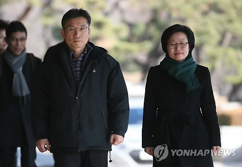 | △ 해산된 통합진보당 소속 김미희·이상규 전 의원이 헌법재판소 결정전 자신들의 지역구를 다시 찾아오기 위해 4·29 보궐선거에 출마하기로 했다, 사진은 이상규(왼쪽), 김미희 전 통합진보당 의원이 지난해 12월 26일 오후 고소인 자격으로 조사를 받기 위해 서울 서초구 서울중앙지검에 출석하고 있다. |