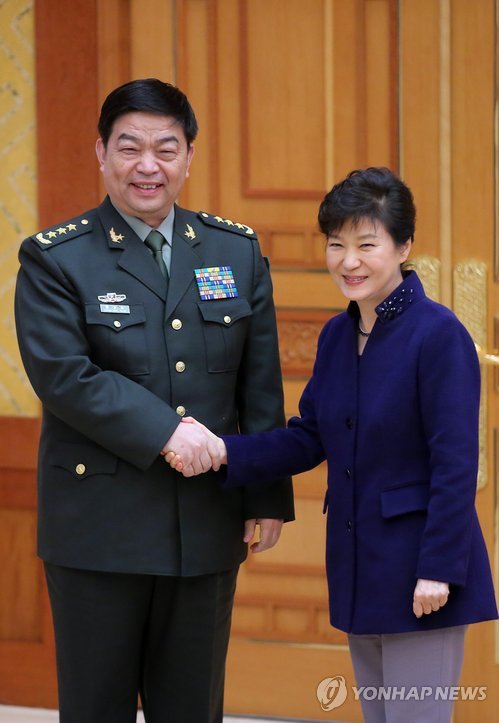 | △ 박 대통령, 창완취안 중국 국방장관 접견 (서울=연합뉴스) 이정훈 기자 = 박근혜 대통령이 4일 오후 청와대에서 창완취안(常萬全) 중국 국방부장을 접견하기에 앞서 악수하고 있다. |