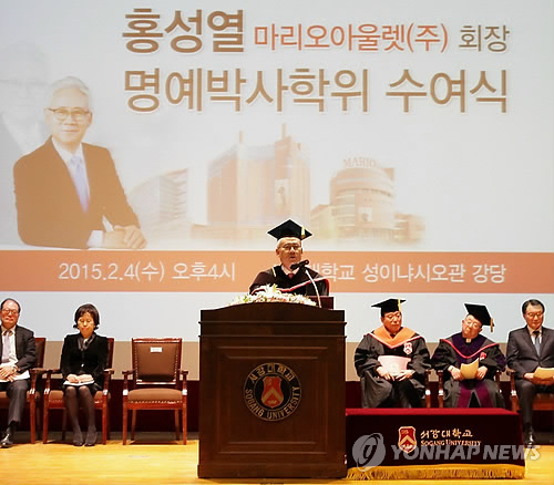 △ 홍성열 마리오아울렛 회장, 서강대서 명예박사 학위 (서울=연합뉴스) 정빛나 기자 = 서강대는 홍성열 마리오아울렛 회장에게 명예 경제학 박사 학위를 수여했다고 5일 밝혔다. 지난 4일 오후 서울 마포구 서강대학교에서 열린 명예학위 수여식에서 홍성열 회장이 인사말을 하고 있다. 2015.2.5 << 서강대 제공 >> shine@yna.co.kr