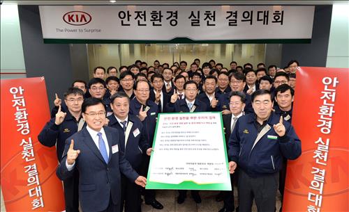 기아차는 5일 경기도 광명시 기아차 생산교육센터에서 박한우 사장, 김종웅 부사장(광주 공장장)을 비롯한 임직원 70여 명이 참석한 가운데 '안전환경 실천 결의대회'를 개최했다.
