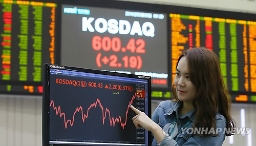 △ 코스닥 6년 8개월만에 600선 돌파 (서울=연합뉴스) 김도훈 기자 = 코스닥이 600선을 돌파한 5일 오전 서울 여의도 한국거래소 홍보관에서 직원이 코스닥 지수를 확인하고 있다. 코스닥이 600선을 넘은 것은 지난 2008년 6월 26일(602.74) 이후 처음이다. superdoo82@yna.co.kr