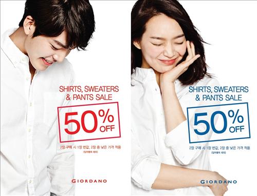 셔츠, 스웨터, 카디건, 트렌치코트 등 인기 상품들로 구성된 '지오다노 스마트룩' 제품을 2장 이상 구매하면 두 번째 상품부터 50% 할인된 가격에 살 수 있다.