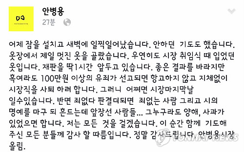△ 의정부시장 '시장직 사퇴' 페이스북 글 (의정부=연합뉴스) 안병용 경기 의정부시장이 5일 선거법 위반 사건 결심공판을 1시간 앞두고 페이스북에 '100만원 이상 벌금형이 나오면 항소하지 않고 시장직을 사퇴하겠다'는 내용의 글을 올렸다. 이글은 현재 삭제된 상태다. 안 시장은 이날 결심공판에서 당선 무효에 해당하는 벌금 300만원을 선고받았다. 사진은 안 시장의 페북에 올라온 사퇴 표명글. 2015.2.5 wyshik@yna.co.kr