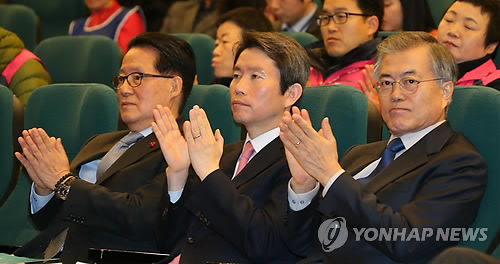 | △ 박수 치는 야당 대표 후보 (서울=연합뉴스) 백승렬 기자 = 새정치민주연합 2·8전당대회 당대표에 출마한 박지원(왼쪽부터)·이인영·문재인 후보가 5일 국회 도서관에서 `을'을 위한 민생정당 어떻게 만들 것인가?'란 주제로 열린 을지로위원회 당대표 후보 초청 토론회에서 박수를 치고 있다. 2015.2.5 srbaek@yna.co.kr |