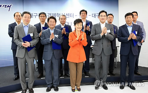 | △ 창조경제혁신센터 확대 출범식 기념촬영 (대구=연합뉴스) 도광환 기자 = 박근혜 대통령이 15일 오전 대구 무역회관에서 열린 창조경제혁신센터 확대 출범식에 참석, 삼성과 벤처기업 간 계약 체결식을 지켜본 뒤 이재용 삼성전자 부회장, 벤처기업 대표들, 권영진 대구시장 등과 기념촬영하며 박수치고 있다. 2014.9.15 dohh@yna.co.kr |