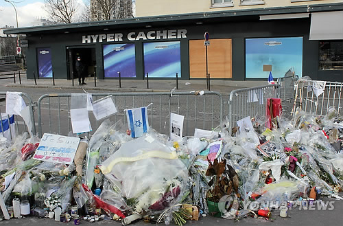 | △ 테러당한 파리 유대인 식료품점에서 경계 서는 무장경찰 (파리=연합뉴스) 박성진 특파원 = 지난달 인질극이 벌어진 파리 유대인 식료품점 '이페르 카셰르' 앞에서 지난 3일(현지시간) 무장 경찰이 경계 근무를 하고 있다. 이곳에서는 지난달 9일 지하디스트(이슬람 성전주의자) 아메디 쿨리발리가 인질극을 벌여 유대인 4명을 살해했다. 2015.2.5 sungjinpark@yna.co.kr |