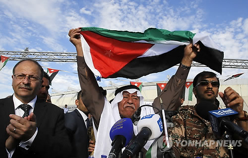 △ (AP=연합뉴스) 요르단 전투기들이 지난 5일 시리아 내 IS 군사훈련 시설과 무기고공습에 요르단 시민들이 'IS 강경 대응'을 지지하는 구호를 외치고 있는 모습.