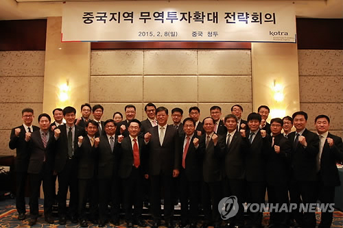 | △ KOTRA, 중국지역 무역관장회의 개최 (서울=연합뉴스) 김재홍 KOTRA 사장 주재로 8일 중국 청두에서 중국지역 무역관장 회의에서 참석자들이 단체사진을 촬영하고있다. 이 회의에는 전 중국지역 무역관장 19명이 참석했다. 2015.2.8 << KOTRA 제공 >> photo@yna.co.kr |