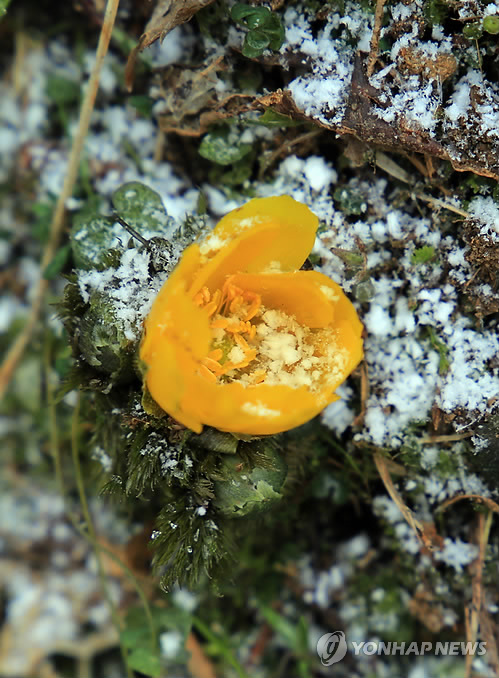 △ (제주=연합뉴스) 고성식 기자 = 8일 제주 산간에 대설특보가 내려진 가운데 제주절물자연휴양림 목교(木橋) 밑 계곡에 노란 꽃을 피운 '봄의 전령' 복수초에도 봄을 시샘하는 눈이 내렸다. 2015.2.8. koss@yna.co.kr