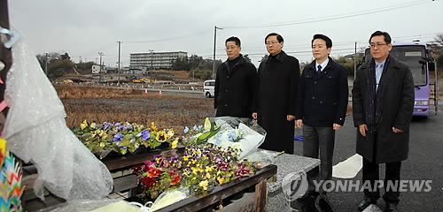 | △ 동일본 대지진 피해지역 위령탑에 헌화하는 남경필 지사 (이시노마키=연합뉴스) 외무성 초청으로 일본을 공식방문 중인 남경필 경기지사가 8일 첫 일정으로 동일본 대지진 최대 피해지역인 미야기현 이시노마키시를 찾았다. 사진은 남 지사가 위령탑에 헌화하는 모습. 2015.2.8 <<경기도 제공>> chan@yna.co.kr |