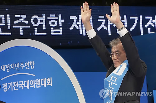 △ 인사하는 새정치민주연합 문재인 대표 (서울=연합뉴스) 이상학 기자 = 새정치민주연합 새 당대표에 선출된 문재인 의원이 8일 서울 송파구 올림픽체조경기장에서 열린 제1차 정기전국대의원대회에서 수락 연설을 마친 뒤 손을 들어 인사를 하고 있다. 2015.2.8 leesh@yna.co.kr