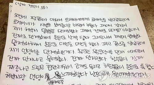| △ 트레이너의 여고생 성추행 사건 진술서 (의정부=연합뉴스) 경기지역의 한 고교 운동부에서 여학생들을 상습 성추행한 혐의로 트레이너를 붙잡아 조사중이라고 경찰은 9일 밝혔다. 트레이너는 여학생에게 자신의 다리를 '오일마사지'하라고 하는 등 상습 성추행한 혐의를 받고 있다. 사진은 피해 여학생 학부모 측에서 공개한 학생이 쓴 진술서. 2015.2.9 suki@yna.co.kr |
