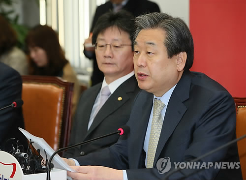 | △ (서울=연합뉴스) 진성철 기자 = 새누리당 김무성 대표가 9일 국회에서 열린 최고위원회의에서 새정치민주연합 문재인 신임 대표에 대해 "대화와 타협이란 정치 본연의 자세로 과거가 아닌 미래로 나아가는, 상생의 파트너십 정치를 통해서 경제활성화와 민생안정에 매진하는 생산적 국회가 될 수 있도록 같이 노력해줄 것을 기대한다"고 말하고 있다. |