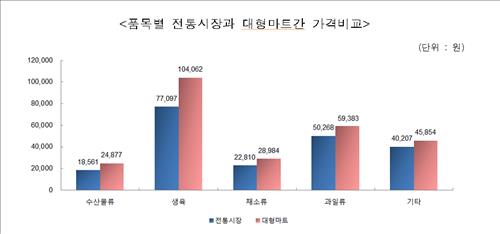 품목별로 전통시장이 대형마트보다 생육(25.9%)을 가장 저렴하게 판매했고, 이어 수산물(25.4%), 채소(21.3%), 과일(15.3%) 순이었다.