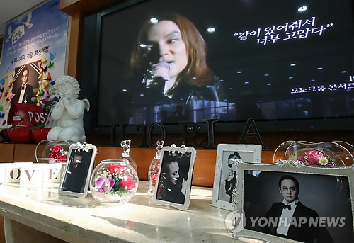| △ 지난해 10월 세상을 떠난 가수 신해철의 작업실이 있던 성남시 분당에 그의 삶과 음악을 테마로 한 '신해철 문화의 거리'(가칭)가 조성된다. 지난해 11월 경기도 안성 유토피아 추모관에 상영 및 전시된 고 신해철의 생전 사진과 영상. (연합뉴스 자료사진) |