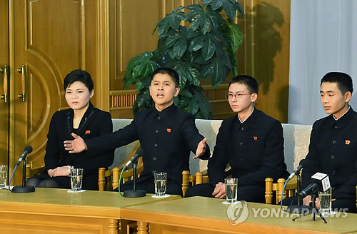 △ '처형설' 탈북 청소년 기자회견 (평양 조선중앙통신=연합뉴스) 지난해 5월 한국으로 오려다 강제 북송돼 처형설이 제기됐던 탈북 청소년 9명이 12일 평양 고려동포회관에서 기자회견을 하고 있다. 2014.12.12 photo@yna.co.kr