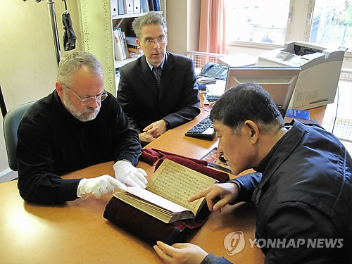 | △ "이게 세계 최고 금속활자본" 프랑스 '직지' 공개 (청주=연합뉴스) 박재천 기자 = 이규상 청주시 고인쇄박물관 운영사업과장이 프랑스국립도서관 동양문헌실에서 현존 세계 최고(最古) 금속활자본인 직지심체요절(直指心體要節·약칭 직지)을 열람하고 있다. 이 과장은 최근 프랑스국립도서관을 방문, 2016년 직지상 시상식·직지축제 때 금속활자본 직지를 일시 대여해 전시하고 싶다는 뜻을 전달했다. 프랑스국립도서관이 과거 청주시에 직지 슬라이드 필름을 제공한 적이 있고, 열람도 부분적으로 허용했지만, 열람 장면 촬영을 허락한 것은 이번이 처음인 것으로 알려졌다. 1377년 청주 흥덕사에서 상·하권으로 간행된 금속활자본 직지는 국내에서는 발견되지 않고 있고, 하권 1권만이 유일하게 프랑스국립도서관 동양문헌실에 보관돼 있다. 2014.12.8 <<고인쇄박물관 제공>> jcpark@yna.co.kr |