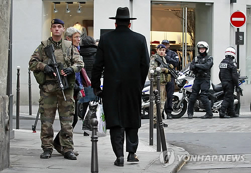 | △ 프랑스, 테러 예방 위해 군인 1만명 동원 (AP=연합뉴스) 프랑스 정부는 12일(현지시간) 이슬람 극단주의자들의 테러로부터 시민들을 보호하기 위해 주요 시설과 학교 등에 군인 1만 명 등 군·경 1만5천 명을 동원하고 유대인 시설에 대한 경계를 강화키로 했다. 국내 치안을 위해 이처럼 많은 군인이 동원되는 것은 처음이다. 사진은 이날 파리 유대인 지구에서 군인과 경찰들이 순찰을 돌고 있는 모습. |