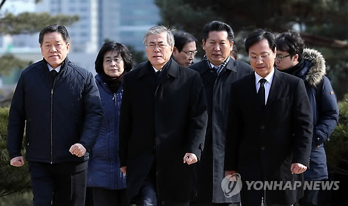 | △ 문재인 대표와 최고위원들 (서울=연합뉴스) 신준희 기자 = 새정치민주연합 문재인 대표와 최고위원들이 9일 오후 용산구 백범 김구 선생의 묘를 참배하기 위해 걸어오고 있다. 2015.2.9 hama@yna.co.kr |