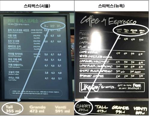 이 단체 조사에 따르면 한국과 달리 스타벅스 일본 등 일부 해외 매장에서는 숏을 포함한 네 가지 종류(숏·톨·그란데·벤티)의 음료 가격을 모두 메뉴판에 일일이 표기하고 있다.