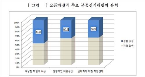 다른 입점업체와 할인쿠폰과 판매수수료를 차등 적용하는 등 부당한 차별(51.7%), 사전에 합의된 수수료 이외의 불분명한 비용을 일방적으로 정산요구(40.3%), 제품파손 시 소비자에 귀책사유가 있음에도 오픈마켓측이 일방적으로 판매자에게 책임전가(38.9%) 등이 뒤따랐다.