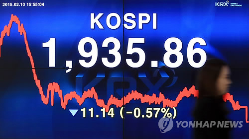 △ 연이은 대외 악재에 코스피 하락 (서울=연합뉴스) 홍해인 기자 = 그리스 불안, 달러 강세, 유가 변동성 확대 등 대외 악재가 이어지며 10일 코스피 지수가 하락했다. 코스피는 전날보다 11.14포인트(0.57%) 하락한 1,935.86으로 거래를 마쳤다. 이날 오후 서울 여의도 한국거래소 홍보관.