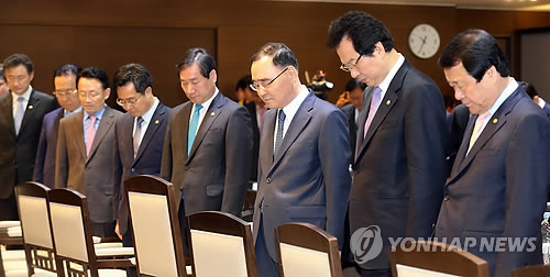 | △ 정홍원 국무총리가 지난해 2월 27일 오전 정부세종청사 대회의실에서 열린 안전관련 관계부처 장관 및 시도지사 간담회에서 참석자들과 함께 경주 마우나 리조트 붕괴사고 희생자들에 대한 묵념을 하고 있다. (연합뉴스 자료사진) |