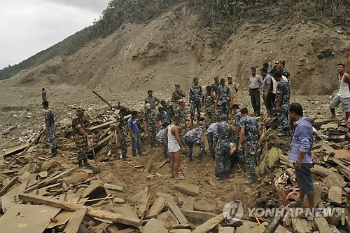 | △ 지난해 8월 이틀간 계속된 폭우로 산사태가 발생한 네팔 북부 산간 신두팔촉 지역에서 군인들이 건물잔해와 토사를 파헤치며 수색작업을 벌이는 모습. 이 산사태로 주택 70채가 토사에 휩쓸리면서 주민 8명이 숨지고 150여명이 실종된 것으로 전해졌다.<<연합뉴스DB>> |