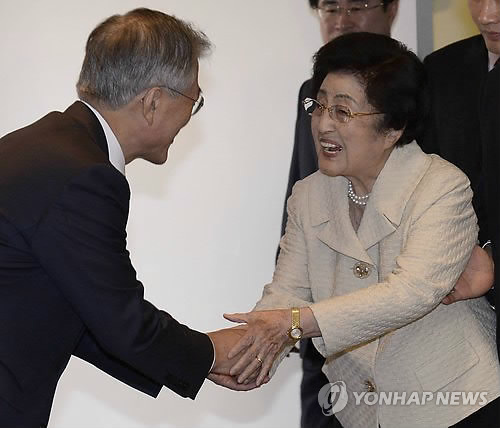 △ 새정치민주연합 새 지도부, 이희호 여사 예방 (서울 국회사진기자단=연합뉴스) 새정치민주연합 문재인 대표 등 새 지도부가 11일 동교동을 예방, 이희호 여사와 인사하고 있다.