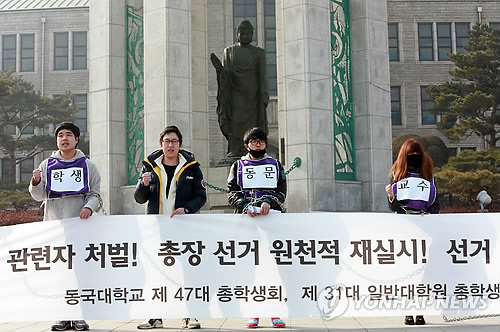 | △ 총장 선거 원천적 재실시 촉구 (서울=연합뉴스) 박동주 기자 = 11일 오전 서울 동국대학교에서 제47대 총학생회·제31대 일반대학원 총학생회 관계자들이 총장 선거개입 관련자 처벌과 선거 원천적 재실시 등을 촉구하고 있다. 2015.2.11 pdj6635@yna.co.kr |
