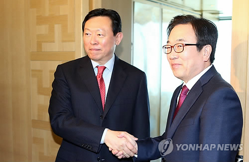 | △ 손잡은 신동빈 롯데회장-서병수 부산시장 (부산=연합뉴스) 조정호 기자 = 신동빈 롯데그룹 회장(왼쪽)이 이달 출범이 예정된 부산 창조경제혁신센터 준비상황을 점검하기 앞서 11일 부산시 부산진구 롯데호텔에서 서병수 부산시장을 만나고 있다. 2015.2.11 ccho@yna.co.kr |