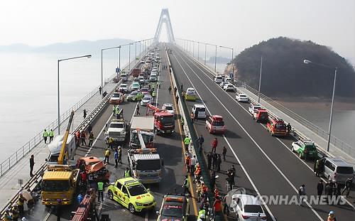 오늘 오전 9시 45분께 인천시 중구 영종대교 서울 방향 상부도로 12∼14km 지점에서 승용차 등 100여 대가 잇따라 추돌했다. 이 사고로 오후 2시 현재 2명이 숨지고 부상자 50여명이 인근 11개 병원으로 옮겨져 치료를 받고 있다. 경찰 관계자는 "안개로 가시거리가 10여m에 불과한 상황"이었다"며 "안개 때문에 사고가 난 것으로 보고 정확한 사고 원인과 피해 현황 등을 조사하고 있다"고 말했다. 경찰은 영종대교 상부도로 1차로를 주행하던 공항 리무진 버스가 앞서 가던 승용차를 추돌한 직후 뒤에서 쫓아오던 차량들이 잇따라 연쇄 추돌한 것으로 보고 있다.