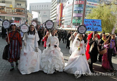 △ 웨딩드레스를 입은 터키 여성 인권운동가들이 2011년 11월 '폭력종식'이라고 쓰인 플래카드를 들고 성폭행, 가정폭력 등에 반대하는 시위를 벌이고 있다. (AP=연합뉴스 자료사진)