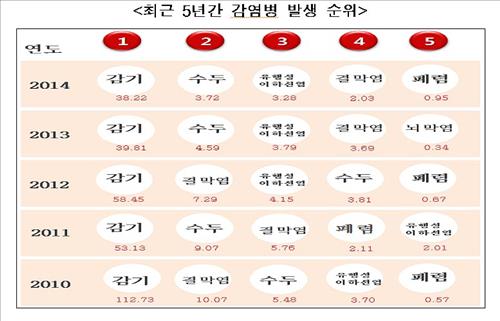이어 수두(3.72명), 유행성이하선염(3.28명), 결막염(2.03명), 폐렴(0.95명), 뇌막염(0.21명) 순이었다.