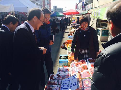 ▲ 정대표 한국소비자원장은 12일 충북 음성시장을 방문했다. 음성시장상인회 관계자들과 간담회를 열어 애로사항을 듣고 전통시장 활성화 방안에 대한 의견을 나눴다. 또 설 성수품 물가 동향을 살피고, 상인들에게 소비자원 생필품 가격정보 제공 사업 '참가격'에 적극적으로 참여해달라고 당부했다.(서울=연합뉴스)