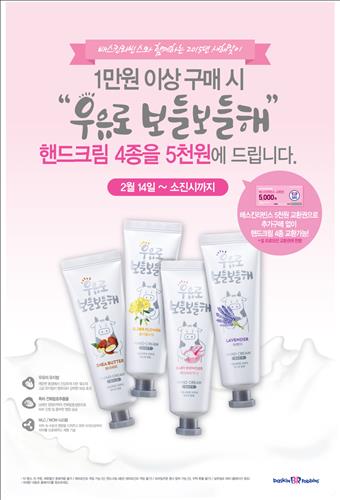 (서울=연합뉴스) 신호경 기자 = 배스킨라빈스(www.baskinrobbins.co.kr)는 14일부터 1만원 이상 구매한 고객에게 '우유로 보들보들해' 핸드크림(4종)을 5천원에 판매한다.
