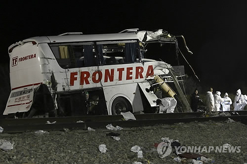 (몬테레이<멕시코> AFP=연합뉴스) 멕시코 동북부 누에보레온 주에서 13일(현지시간) 화물열차와 버스가 충돌해 최소 16명이 사망하고 30명이 부상했다.