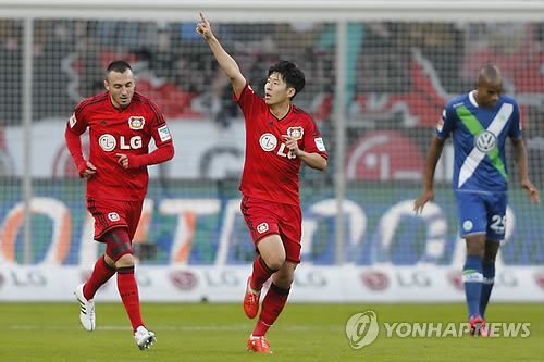 | △ 레버쿠젠의 손흥민(가운데)이 14일(현지시간) 독일 레버쿠젠의 바이아레나에서 열린 볼프스부르크와의 2014-2015 독일 프로축구 분데스리가 21라운드 홈 경기에서 득점에 성공한 뒤 기뻐하고 있다.(EPA=연합뉴스) |