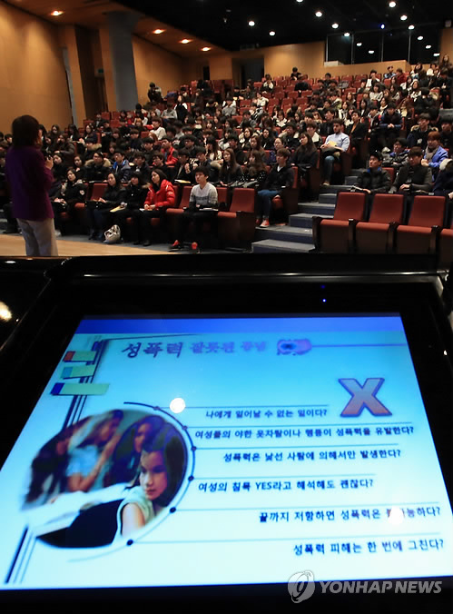 △ 대학 새내기 대상 성폭력 예방교육 (서울=연합뉴스) 홍해인 기자 = 12일 서울 종로구 명륜3가 성균관대학교 경영관에서 이 대학 경영학과 신입생들이 이복실 전 여성가족부 차관으로부터 성폭력 예방교육 특강을 받고 있다. 2015.2.12 hihong@yna.co.kr