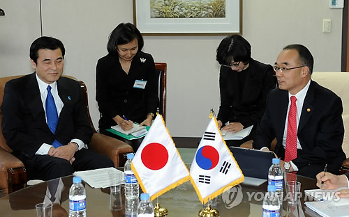 △ 2012년 11월 24일 오후 정부과천청사에서 열린 한ㆍ일 재무장관회의 모습. 박재완 당시 기획재정부 장관과 조지마 고리키 일본 재무상이 얘기를 나누고 있다. 한일관계 악화 속에 그 이후 한일 재무장관 회담이 열리지 않았다. (연합뉴스.자료사진)